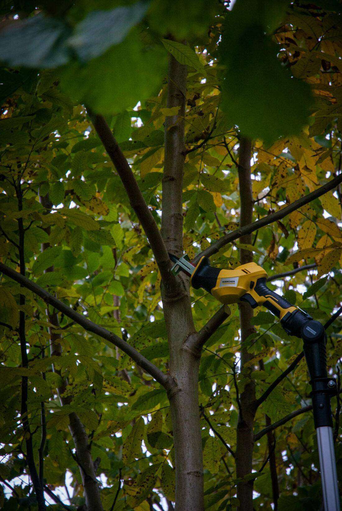 Wenn ihr Bäume fällen müsst, ist der Herbst eine gute Zeit, denn das ist nur zwischen Oktober und Februar erlaubt. Da wir bei uns im Garten keine Bäume über fünf Meter haben dürfen, musste zuletzt unsere Walnuss gehen. Ganz schön tricky, denn wir mussten dafür am Hang arbeiten! Für das Fällen das Baumes haben wir die Kärcher Akku-Astsäge PGS 4-18* mit derKärcher Teleskop-Erweiterung* verwendet.