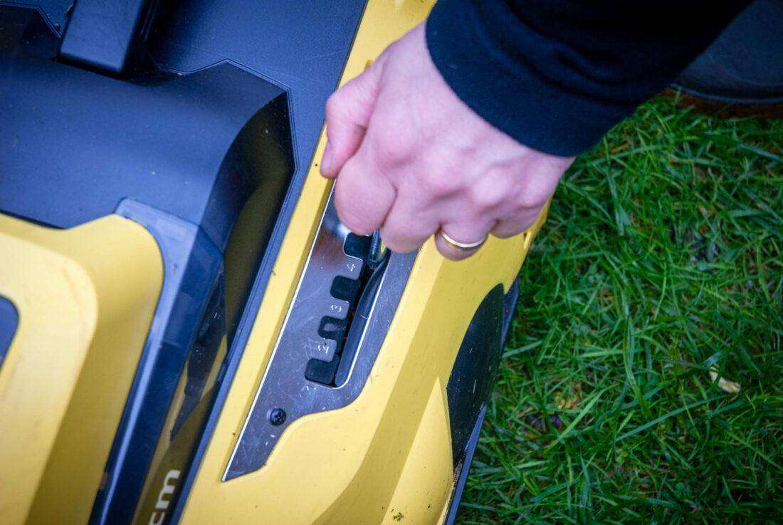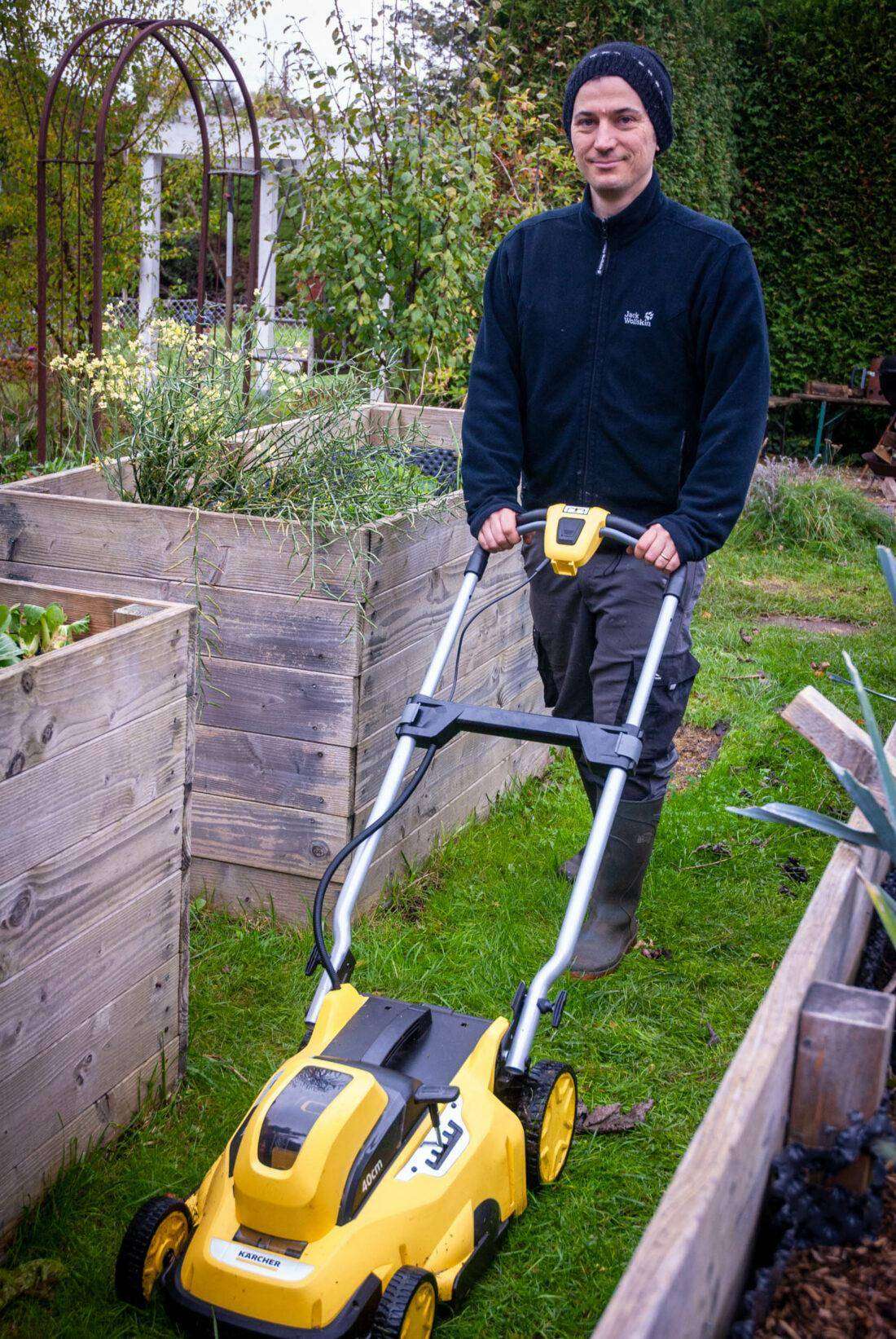 - Mäht ein letztes Mal euren Rasen. Stellt die Länge der Halme dafür auf 4 cm ein. Wir nutzen den Kärcher Akku-Rasenmäher LMO 36-40*