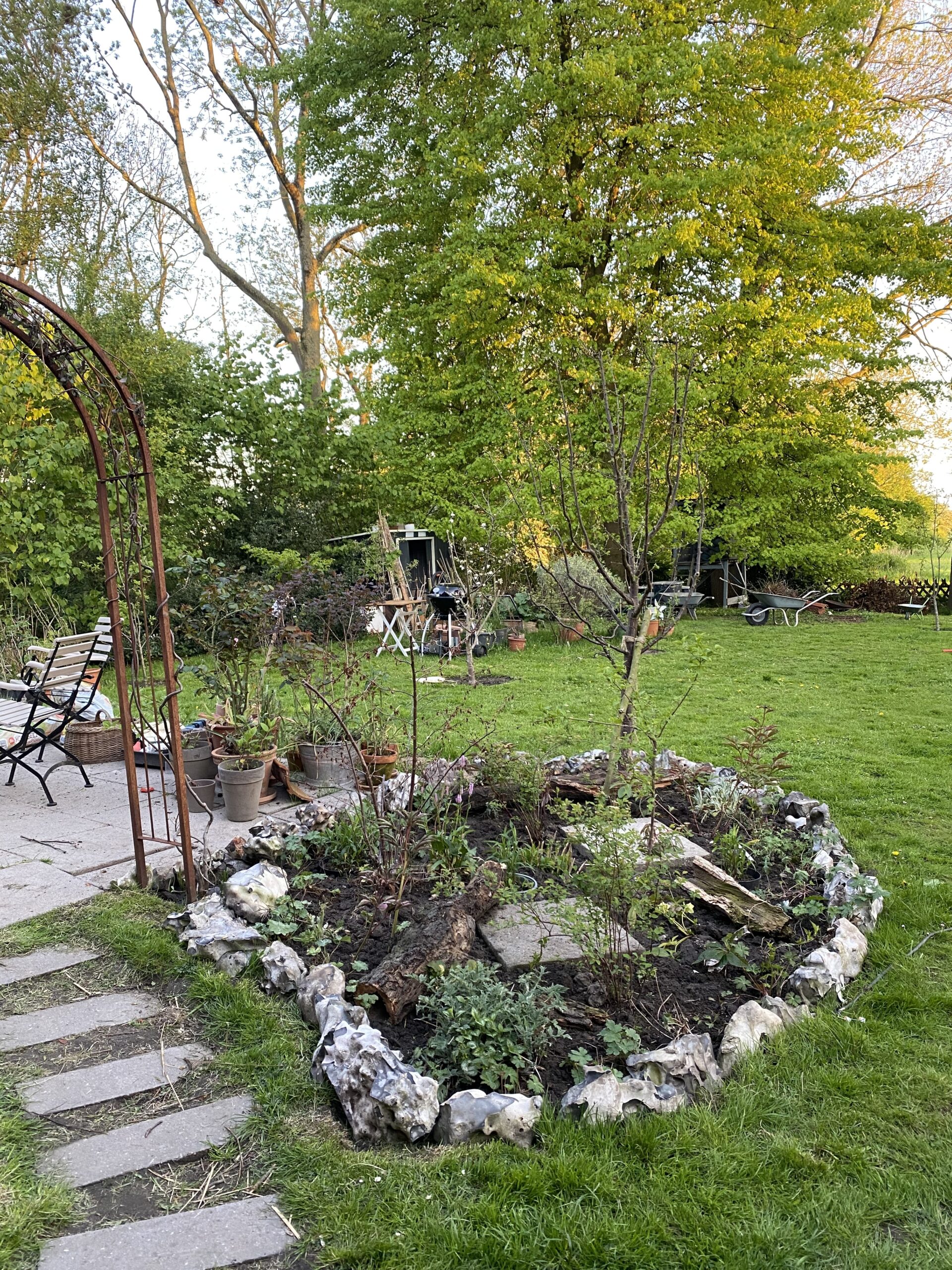 - Ich war mal ein Teich: Kräuterspirale und auch zahlreiche Beete haben wir mit Feldsteinen gestaltet, die wir über kleinanzeigen bekommen konnten.