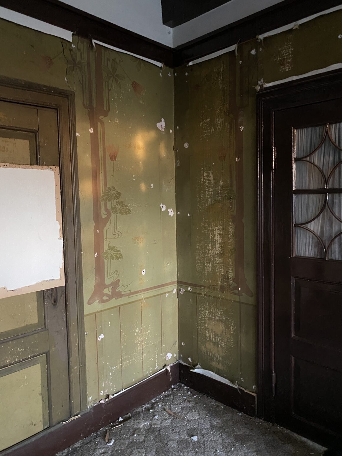 Eine unserer größten Überraschungen haben wir in der Wohndiele erlebt. Da war diese Stoffbespannung, die irgendwie … nicht mehr so ganz frisch war. Als wir sie entfernten, kam darunter eine bemalte Wand zum Vorschein – mit grünen Blättern, Kastanien oder Monsterablättern (da sind wir uns noch nicht einig) und wunderschönen Ornamenten. Unsere Denkmalschützerin nennt das eine “Farbfassung”. Klingt schick, oder? Jetzt kommt eine Restauratorin vorbei, und wir sind gespannt, was sie dazu sagt.